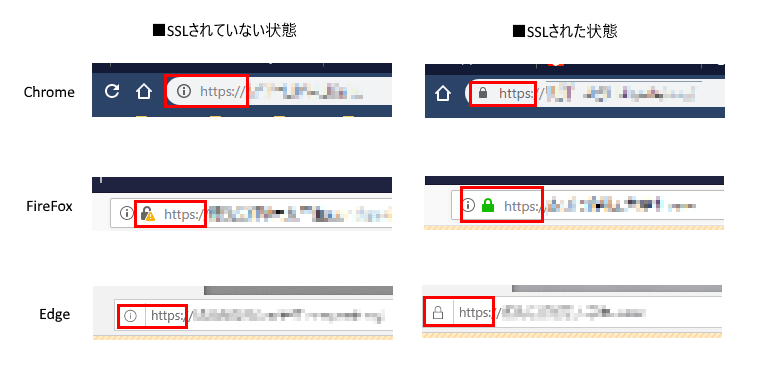 一般的なブラウザ( Google ChromeやMicrosoft Edgeなど)では、SSL化されていないサイトの入力フォームなどでは、「このページは保護されていません」といった表示がされるようになりました。
